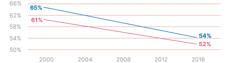 Sexofmaried respondents declines over time (25-55 years),General Social Survey: 2000-2016