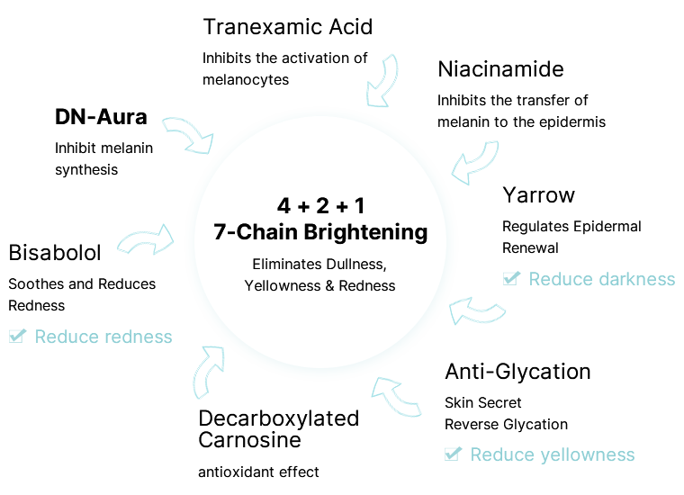 New Dual Anti-Aging for Whitening | Excess free radicals accelerate skin aging and hyperpigmentation | Astaxanthin, Carnosine,Coenzyme Q10 | Suitable for yellowish, dull, and lackluster skin | Limited whitening efficacy on its own; mainly supports whitening Auxiliary Whitening |